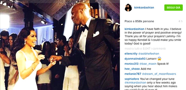 IL SUO CUORE STA BENE. Lamar risponde agli stimoli fisici e verbali dei medici ed anche il suo cuore sembra essersi ripreso: l’ex campione di basket non ha neppure più bisogno del respiratore artificiale. Buone notizie che permettono ai familiari del cestista (oltre la zia materna, al capezzale di Odom c’erano i due figli adolescenti Destiny e Lamar Jr, avuti da un precedente matrimonio) ed al clan Kardashian-Jenner di tirare un sospiro di sollievo. E sono state le sorelle di Khloe, Kim Kardashian (moglie di Kanye West) e la modella Kendall Jenner in questi giorni ad affidare le proprie preghiere ed i propri pensieri ai social network. Kim Kardashian ha postato una foto che la ritrae in compagnia del suo ex cognato, accompagnato da una commovente didascalia: “Ho fede in te! Credo nel potere della preghiera e dell’energia positiva! Grazie a tutti per le vostre preghiere! Lammy sono davvero felice di averti fatto sorridere oggi insieme a Kendall. Dio è buono“. Indiscrezioni parlano di un “Ti amo” scappato di bocca a Khloe Kardashian, frase a cui il cestista avrebbe tentato di rispondere.