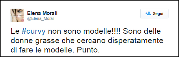 “Le curvy non sono modelle!!!! Sono delle donne grasse che cercano disperatamente di fare le modelle. Punto”. Le parole di Elena Morali non lasciano spazio a dubbi e scatenano l’ira funesta degli internauti.
