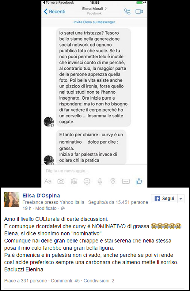 La foto pro Vale Rossi della bionda showgirl è anche spunto per un attacco ironico e pungente di Elisa D’Ospina, questa volta usando il social network Facebook. “Amo il livello CULturale di certe discussioni.E comunque ricordatevi che curvy è NOMINATIVO di grassa – scrive la modella curvy, facendo riferimento ad un errore grammaticale presente in un  post “offensivo” della bionda – Elena, si dice sinonimo non “nominativo”. Comunque hai delle gran belle chiappe e stai serena che nella stessa posa il mio culo farebbe una gran bella figura. Ps. E’ domenica e in palestra non ci vado, anche perché se poi vi rende così acide preferisco sempre una carbonara che almeno mette il sorriso. Baciuzzi Elenina”.