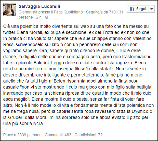 La Lucarelli continua: “Leggo delle crociate contro stà ragazza, Elena non ha un ministero e non insegna filosofia alla statale. Non si sente in dovere di sembrare intelligente e permettetemelo, fa nè più nè meno quello che fa tutti i giorni Belen risparmiandoci almeno la finta posa casuale “non vi sto mostrando il culo ma gioco con mio figlio sulla battigia inarcando per caso la schiena ripresa di tre quarti in modo che il mio culo esca meglio”. Elena mostra il culo e basta, senza far finta di voler fare altro. Non è il mio modello di vita e fondamentalmente di ‘sta polemica non me ne frega nulla, però la capirei se’sta roba l’avessero fatta la D’Amico o la Gruber, dalla Morali mi ha sorpreso solo che abbia evitato il pizzo per una più sobria lycra”.
