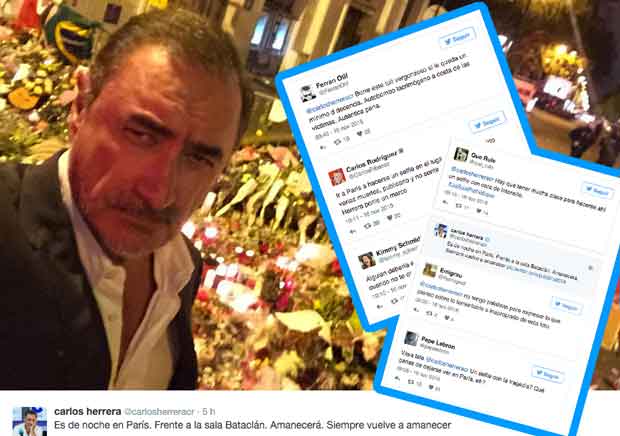Carlos Herrera, giornalista spagnolo, ha pensato di scegliere l’esterno del Bataclan per il suo macabro selfie a Parigi, l’autoscatto è stato postato sul social network Twitter scatenando un’ondata d’indignazione ma anche scatenando la fantasia di molti internauti che al gesto idiota e vanesio di Herrera hanno dedicato numerosi memes. Ma c’è poco da ridere: il luogo dove parenti, amici, cittadini qualunque si recano a portare fiori e candele non può tramutarsi in uno sfondo choc per un selfie al fine di tirare sui social quanti più “like” possibile.