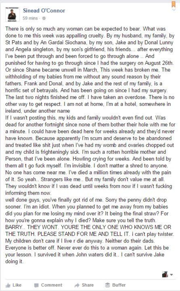 E’ al sicuro e sta bene Sinead O’Connor, l’indimenticabile interprete del brano “Nothing compares to you”. L’artista irlandese ha shoccato il mondo con il suo post sul social network Facebook, nel quale annunciava l’intenzione di volersi suicidare. “Le ultime due notti mi hanno sfinito. Ho preso una dose eccessiva. Non c’è altro modo per ottenere rispetto – ha scritto Sinead O’Connor – Non sono a casa ma in un hotel, da qualche parte in Irlanda, sotto falso nome. Se non stessi postando questo, i miei figli e la mia famiglia neanche se ne accorgerebbero, potrei essere morta da settimane e non lo saprebbero. Una donna può sopportare fino a un certo punto”. La polizia, allertata dai followers della cantante, è subito accorsa ad accertarsi delle reali condizioni della donna.