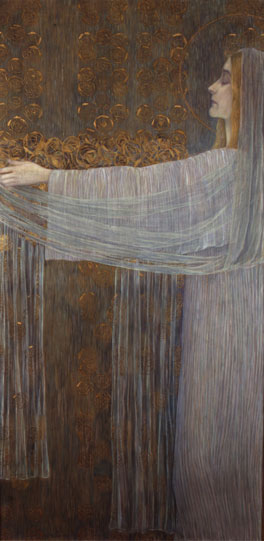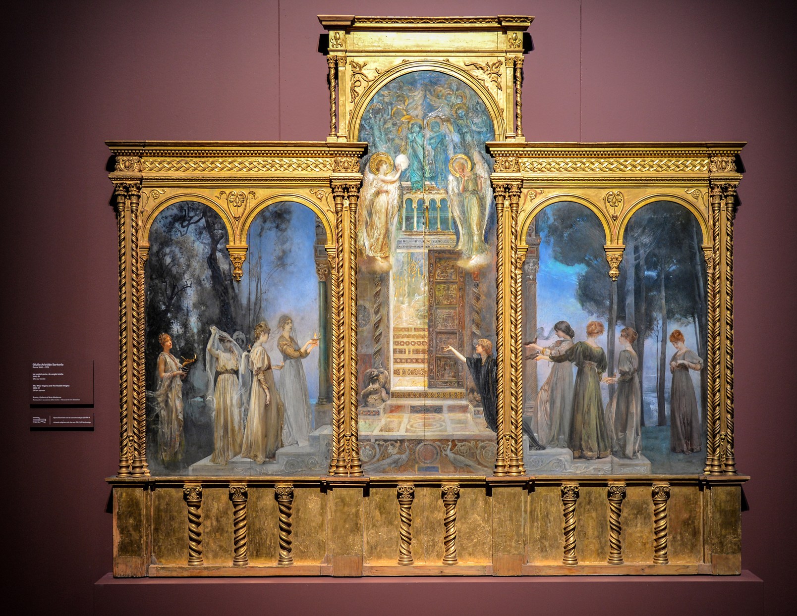 Dopo di che, si passa al tema religioso, non più affrontato attraverso le parabole e le rappresentazioni comuni a tutta la storia dell’arte, ma con una certa attenzione per il misticismo e le storie dell’Antico Testamento. “Le Vergini savie e le Vergini stolte” di Giulio Aristide Sartorio è un meraviglioso trittico in perfetto stile medievale che mostra come soltanto alle spose che hanno tenuto accesa la fiaccola per il loro futuro marito sia aperta la porta verso i piaceri del matrimonio. Accanto vi è “L’offerta (Il miracolo delle rose)” di Wilhelm List, dalla solenne sacralità e dall’aurea bellezza.