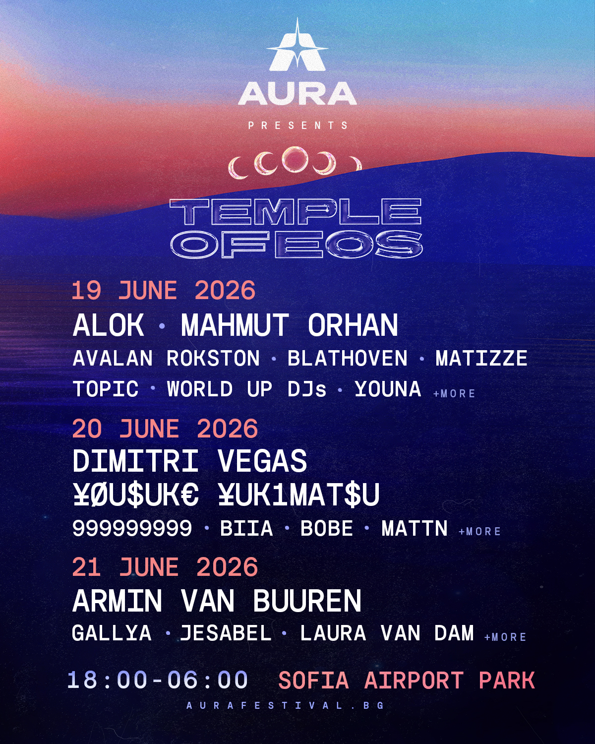 L’edizione 2026 di AURA Festival avrà come filo conduttore il tema Temple of EOS, che trasformerà l’Airport Park in un’area con più stage, scenografie ed installazioni, il tutto opportunamente potenziato e con una line-up assolutamente trasversale, che spazierà dalla House alla Techno, grazie alla presenza tra gl altri di Armin van Buuren, Dimitri Vegas, ALOK, Mahmut Orhan, 999999999, ¥ØU$UK€ ¥UK1MAT$U e BIIA.